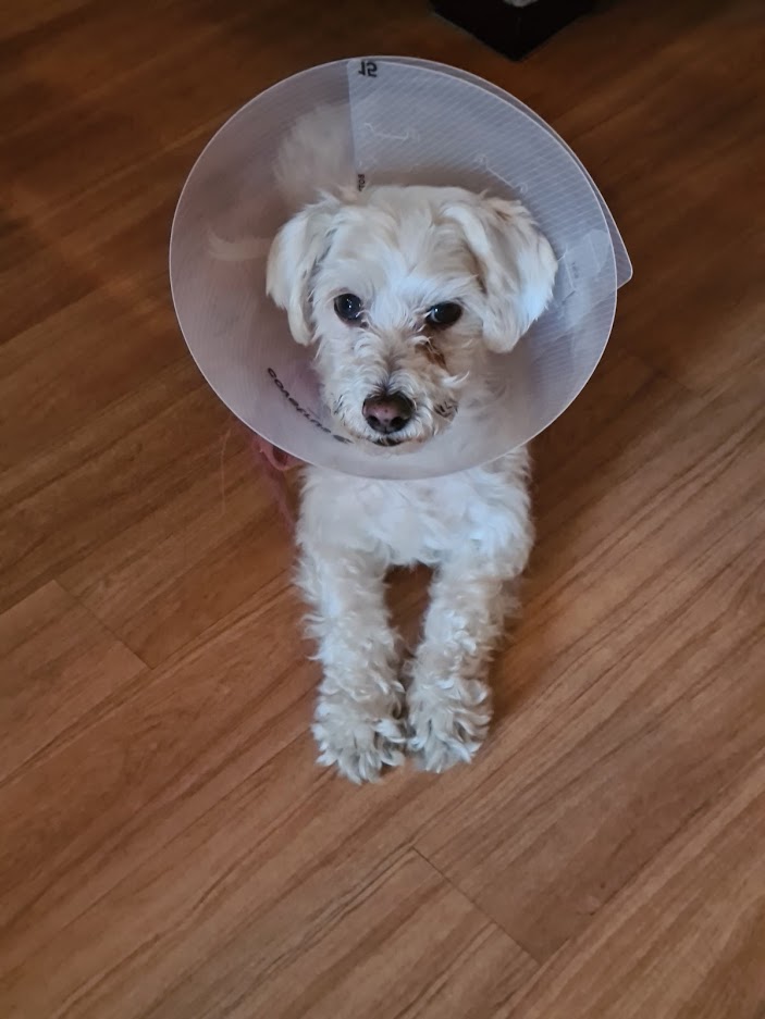 The vet checked him over and it appears he has an eye infection and allergies. He gave us an antibiotic cream and told us to give him 1/2 a Benadryl for the allergies for the next 7 days. He doesn’t want him scratching his eyes so he gave him the “cone of shame”. Poor pup!
