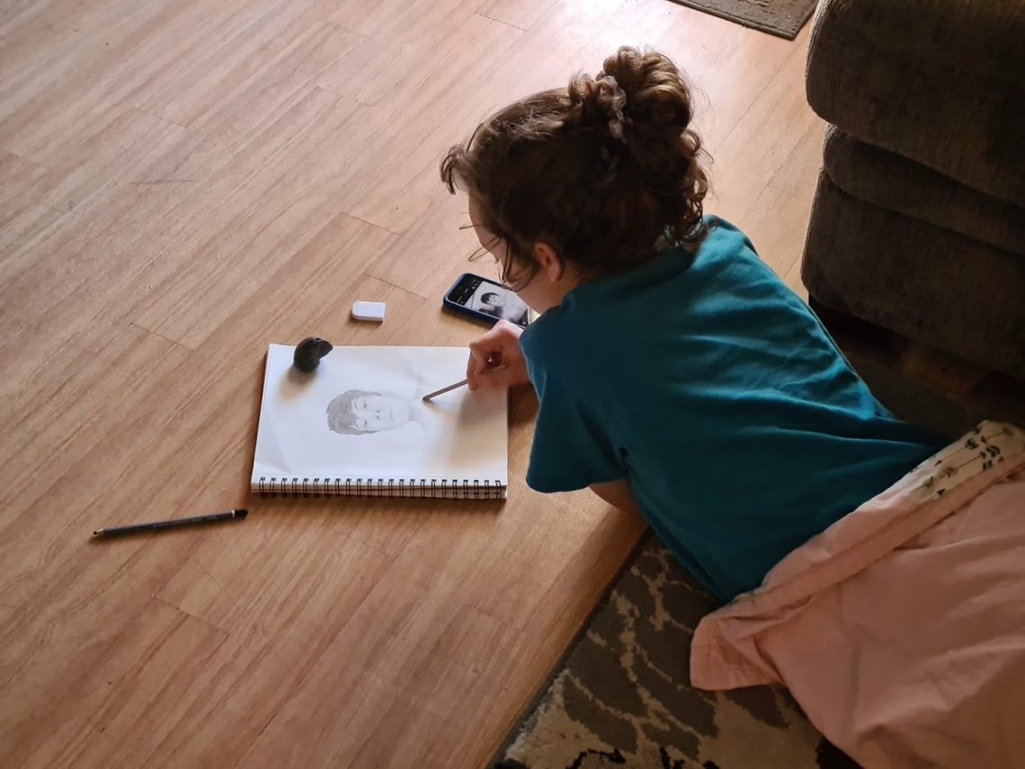 Friends April 4, 2021 / Alayna’s friend Sam wanted a portrait for his birthday and Alayna was happy to make that wish come true. I love watching her draw. She just keeps getting better and better!